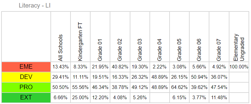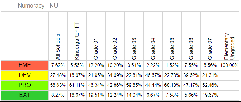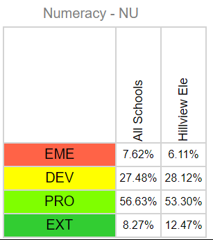 Students are engaged in setting personal learning goals for literacy and numeracy through conferring with teachers and parents throughout the year. Students are able to reflect on their growth and development and identify their strengths and stretches throughout the school year. Hillview staff continue to create and engage in responsive and inclusive literacy and numeracy teaching and assessment practices. Literacy: In reviewing our end of the year 2023/2024 literacy data, our results indicate that over 55% of our students in kindergarten to grade 7 are proficient or extending in literacy. Hillview continues to align with the district averages for literacy as seen in the data charts below. Numeracy: In reviewing our end of the year 2023/2024 numeracy data, our results indicate that over 65% of our students in kindergarten to grade 7 are proficient or extending in numeracy. Hillview continues to align with the district averages for numeracy as seen in the data charts below.